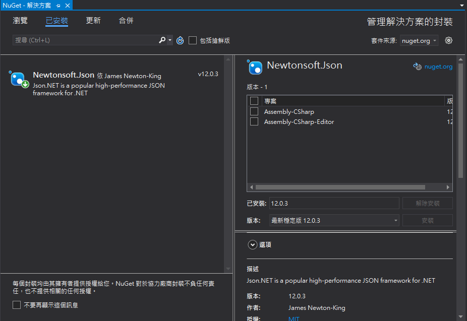- 回到 Visual Studio 專案 .sln 所在目錄, Packages 即是存放 NuGet 安裝套件的目錄. 以 Json.NET 套件為例, 複製 .\Packages\Newtonsoft.Json.12.0.3\lib\netstandard2.0\Newtonsoft.Json.dll 至 Plugins 資料夾
