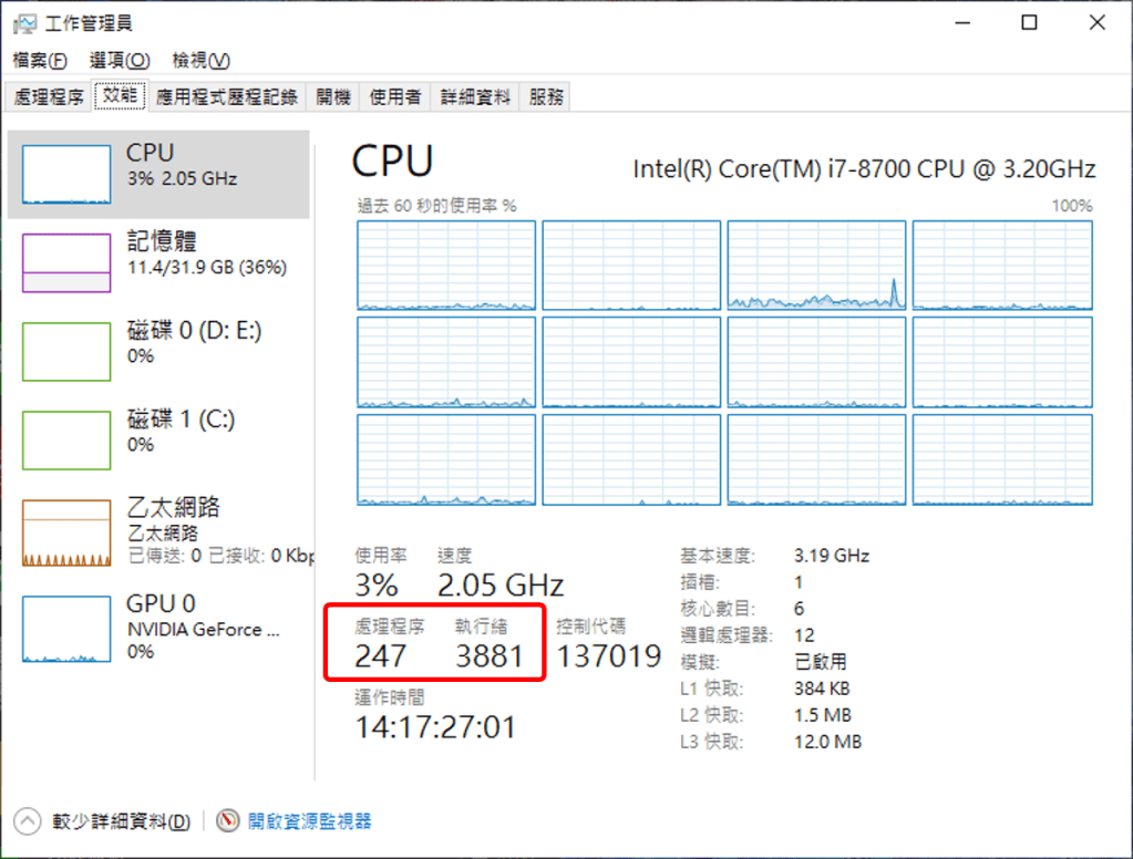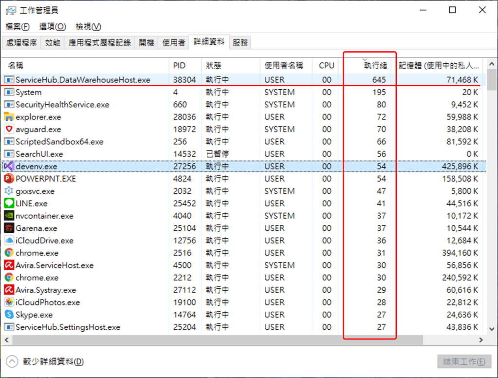 我能們能簡單從工作管理員「效能」頁籤看到當前執行緒數量. 以及切換至「詳細資料」, 打開「執行緒」欄位, 看到每個應用程序的執行緒數量.