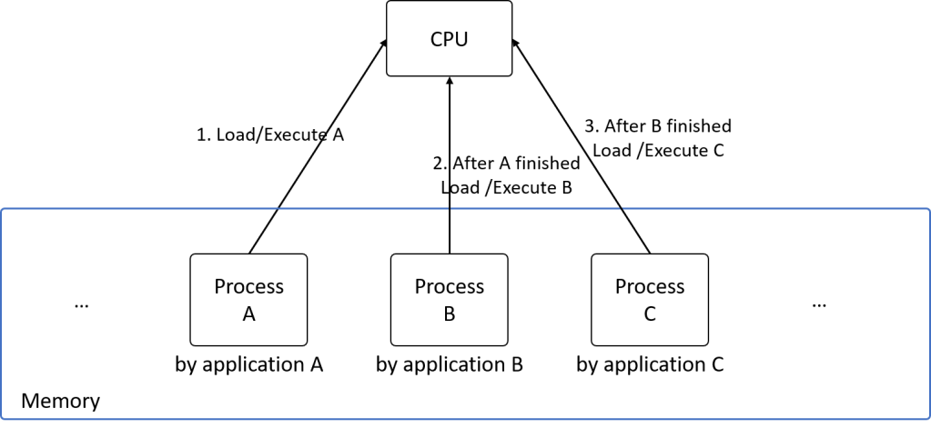 早期電腦剛出現時, 作業系統本身與應用程序都是以一行行的指令接續執行. 如果指令包含 Function (函式), 就要等函式回傳結果後在繼續下一個指令. 運作起來就像是排隊一樣.