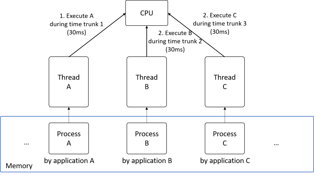 Thread A 運行 30ms, 換 Thread B 運行, 以此類推. 如此一來, CPU 就好像能「同時」執行多個工作.