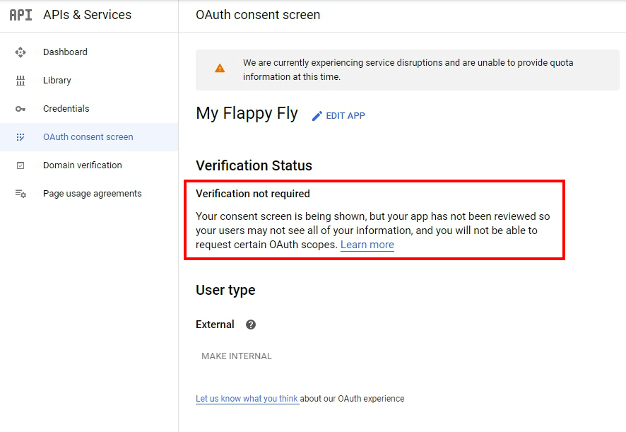 使用者類型 (User Type) 選擇外部 (External) 允許任何擁有 Google 帳號的使用者.