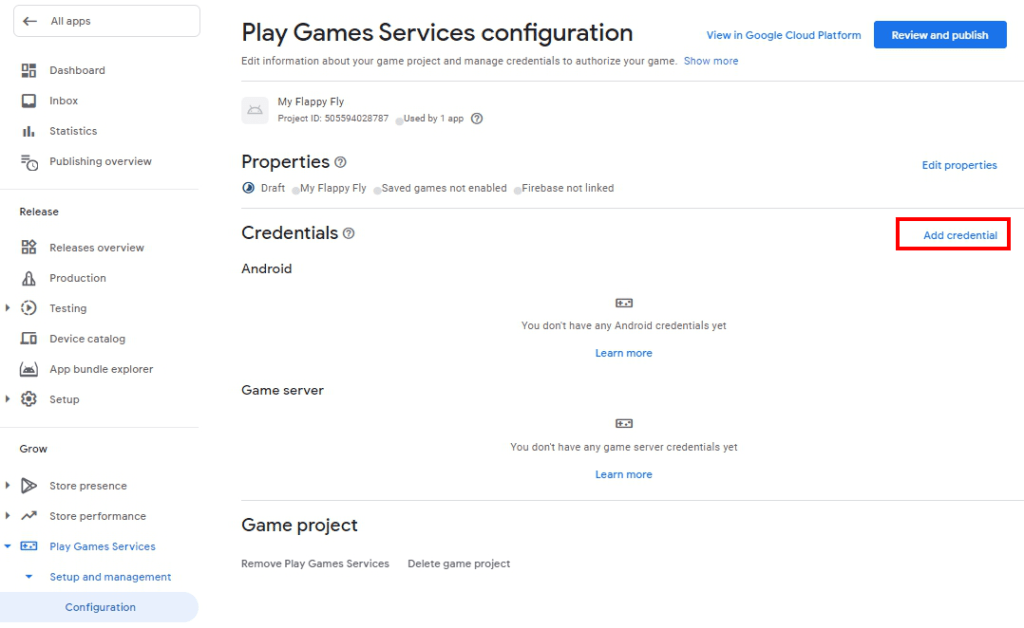 進入 Google Play Console, 選擇指定的應用程式 (My Flappy Fly), 再選 Play 遊戲服務 (Play Games Services) > 設定與管理 (Setup and management) > 設定 (Configuration).
