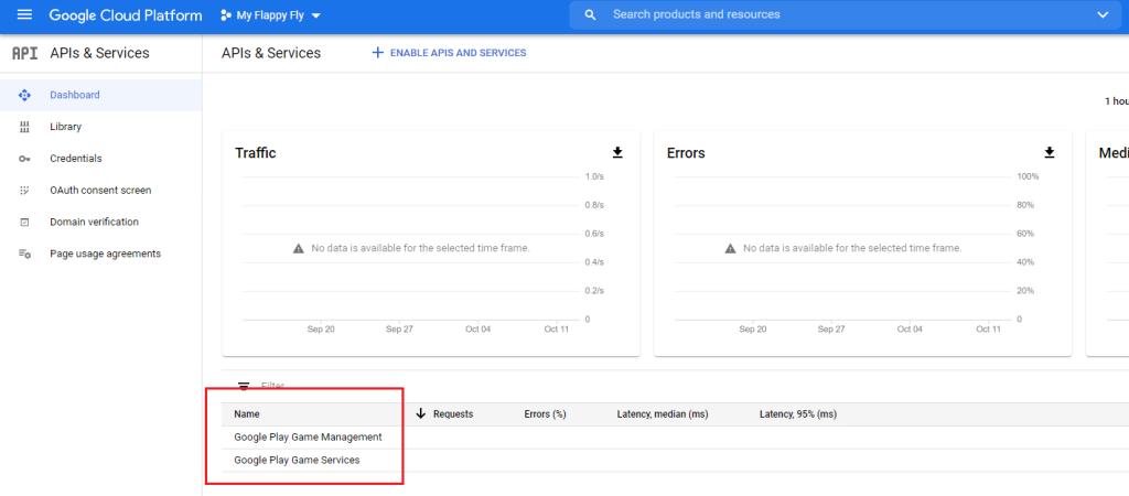 可以看到成功創建 “My Flappy Fly" 的 GCP 專案, 點擊右上角 “Google Platform 中查看" (View in Google Cloud Platform) 會轉跳至 GCP API服務頁面.
