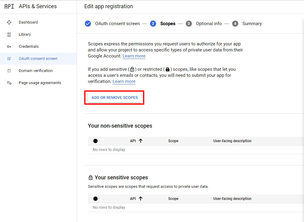 接著要設定授權同意的範圍 (Scope), 告訴使用者使用此應用程式會索取哪些資訊/權限. 這次只是使用 Google Play Game Services 中的登入與排行紀錄, 勾選2項即可.