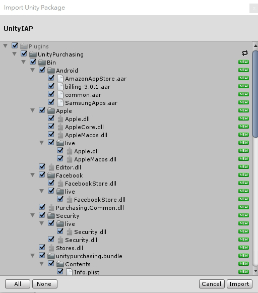如果沒有特定只要安裝哪個平台的內購套件, 直接選取 All > Import 即可. 當中也包含 Demo 用的場景/範例.