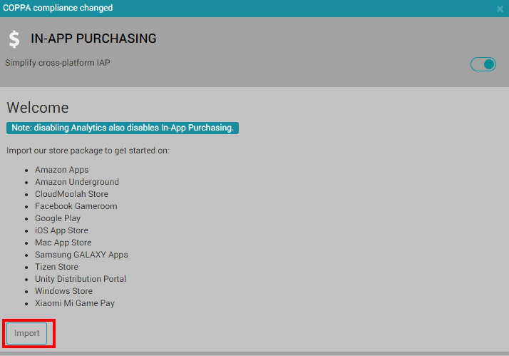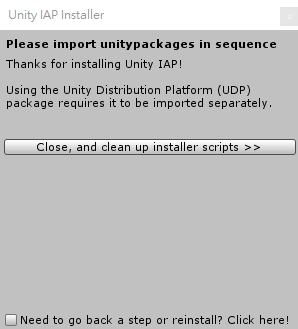 設定成功後便可匯入 IAP 套件. 目前 IAP 套件已能整合各種平台的內購付費, 不只 Google Play, App Store, 也有 Window Store, 小米 Game Play… 等.