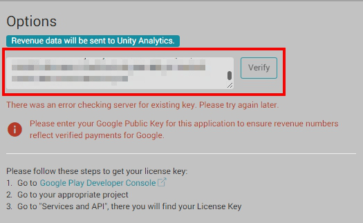 - Google Public Key 輸入到 Services > IN APP PURCHASING 後有可能會出現格式錯誤, 先嘗試確認 Analytics 有正常運作, 或重新打開 Unity project. https://forum.unity.com/threads/cant-verify-googleplay-license-key.570337/