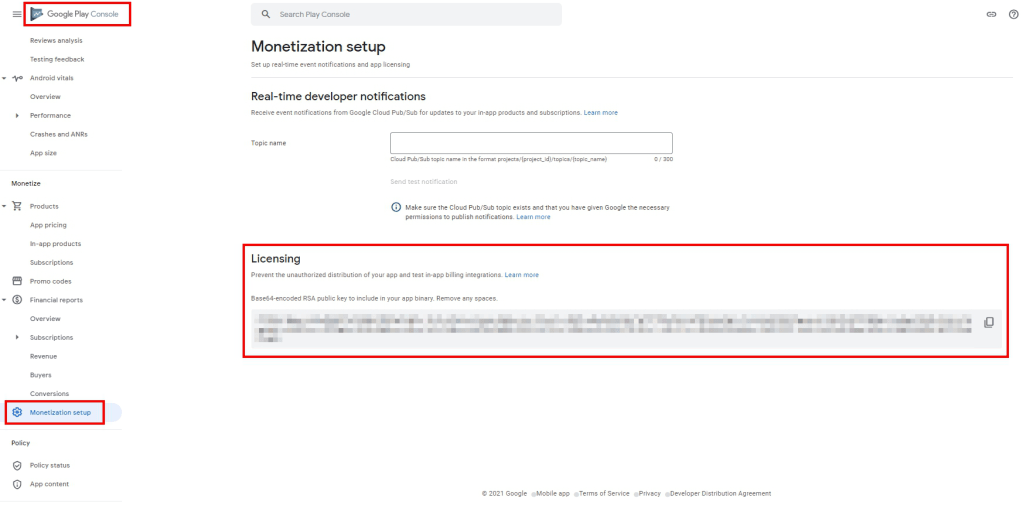 Google Public Key 從 Google Play Console 選定應用程式 > 營利/營利設定 (Monetization setup) > onetization setup) > 授權 (Licensing)