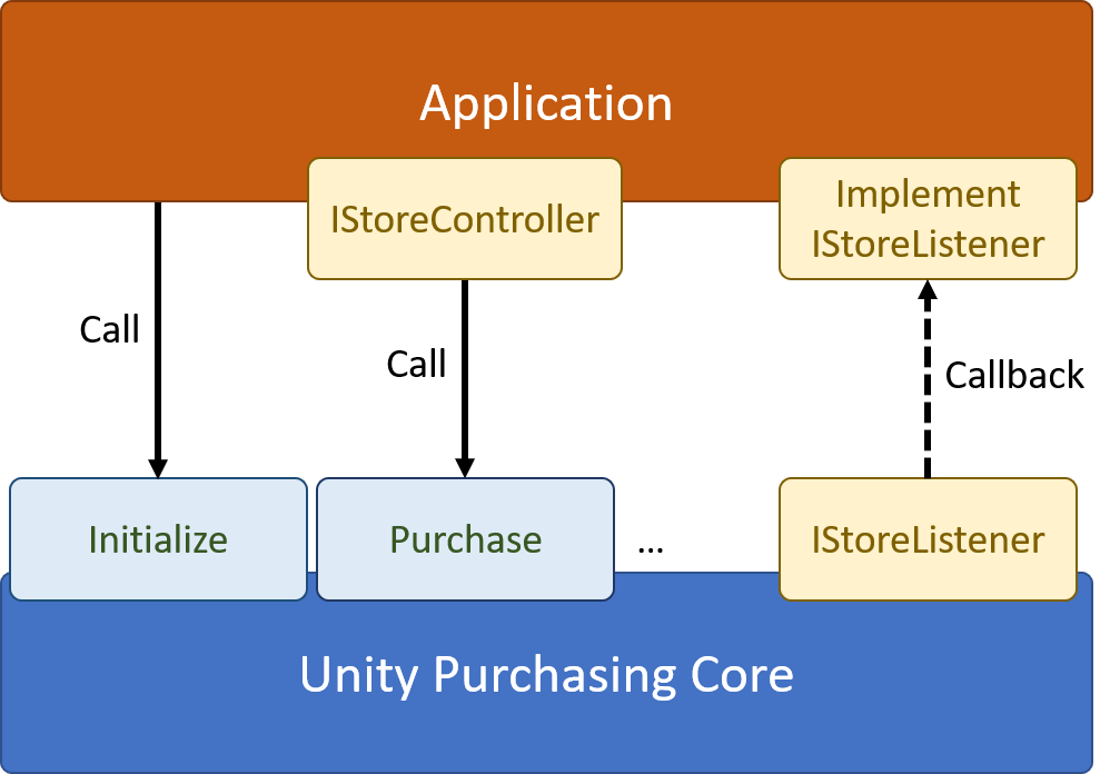 根據 UnityEngine.Purchasing.dll 描述的 IStoreListener 介面, OnInitialized, OnInitializeFailed, OnPurchaseFailed, ProcessPurchase.